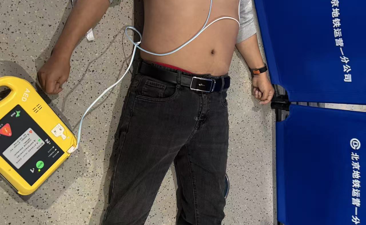 工作人员立即启动急救流程,持续为患者进行规范心肺复苏,同时通过站内广播紧急寻找医护人员,并快速取来站内AED设备。